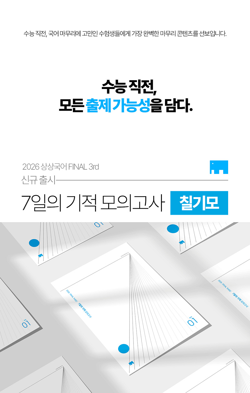 COMPANY CONTENTS 모의고사x이매진 만점자 인터뷰 단행본 초,중등 STORE 온라인 패키지 오프라인 시즌 단행본 초,중등 COMMUNITY 공지사항 등급컷 FAQ 1:1 문의 시행 학원 찾기 채용 지원 베타 테스터 성적 확인 도입 회원가입 로그인 게시글 검색 검색어를 입력하세요. 마침내 수능 국어 학습에 가장 적절한 답을 찾았습니다 기출 및 연계 기본 학습과 반드시 병행해야 할 연계 반복/심화, 실전 훈련에 가장 최적화된 구성을 선보입니다. Scroll Down 구매하기 이매진월드 with 범작가 예스24 메가스터디 대성마이맥 다른 상품 보러 가기